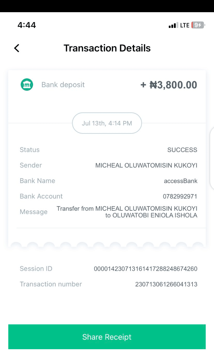 “He told me to call my account number which is opay and he dropped from my car without showing me the receipt for the money he sent , when I was about entering the house, I ask if he had sent the money, he say yeah. Then I checked my opay and found the 3,800 balance.”