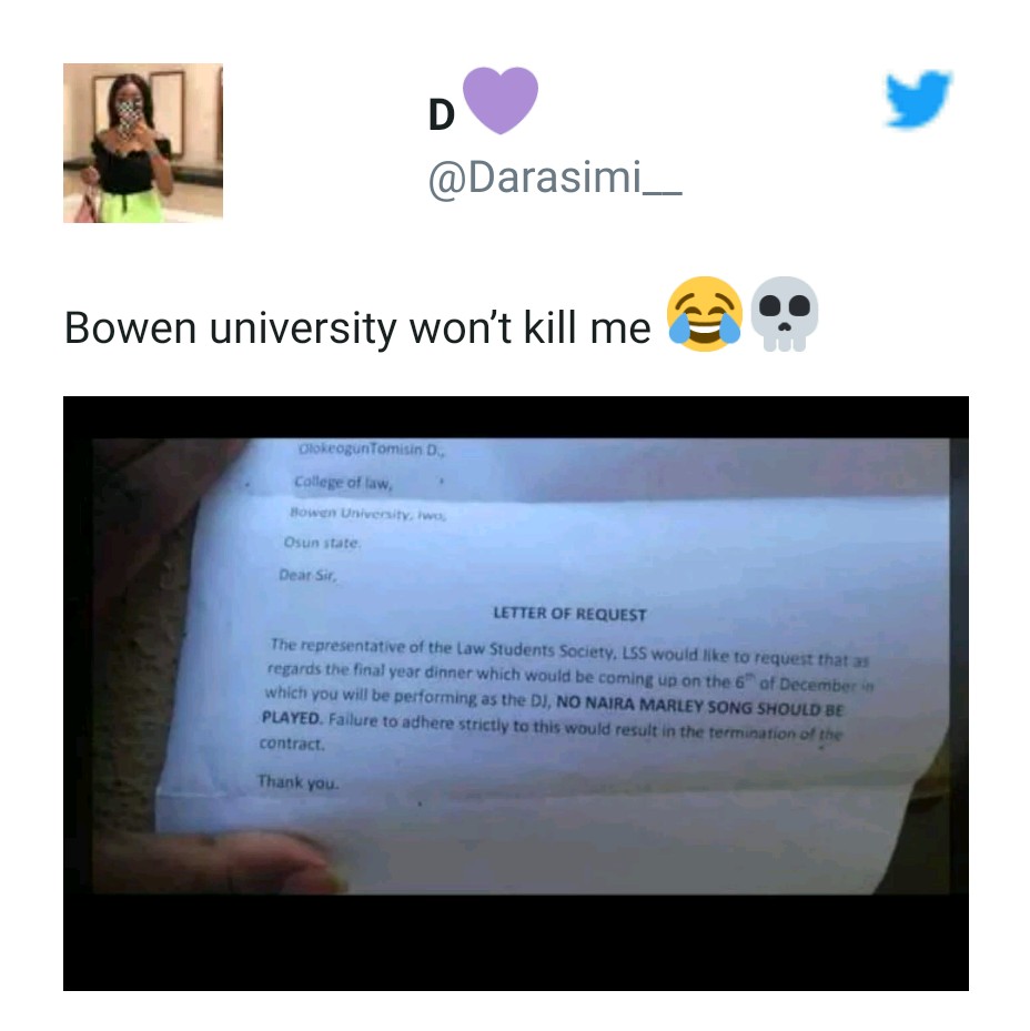 The student association of the Faculty of Law of Bowen University has sent a warning letter to the DJ coming to play at their dinner event requesting the DJ to shun any song from Naira Marley at the event.
