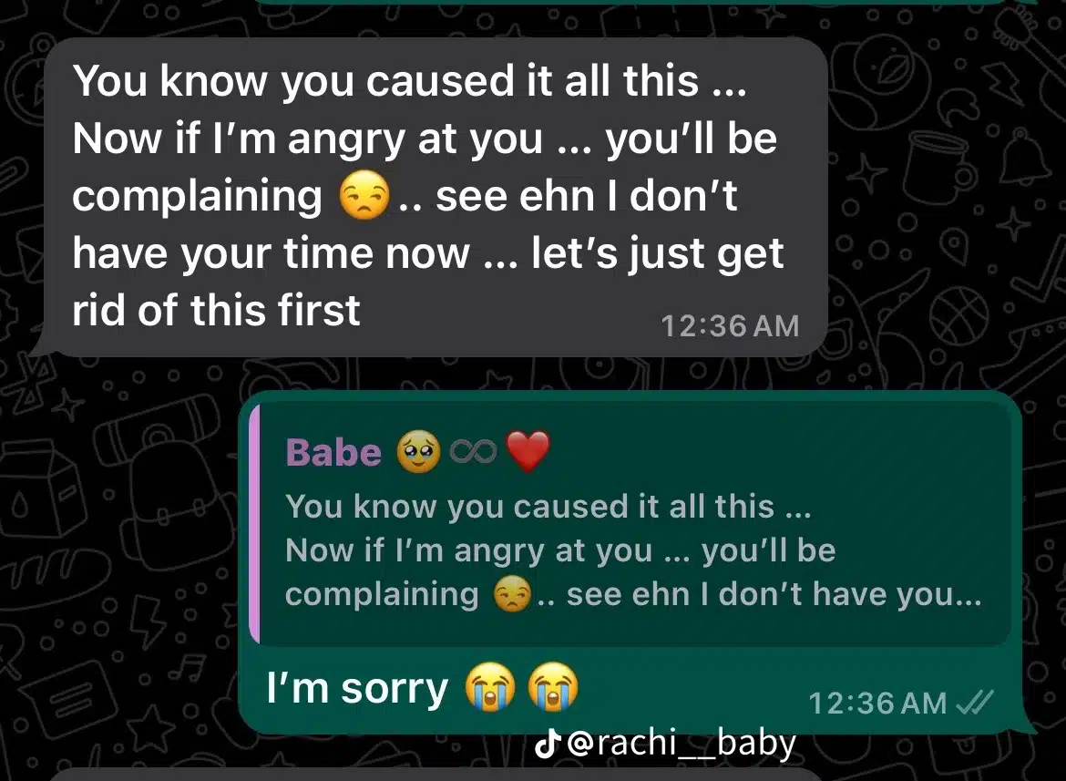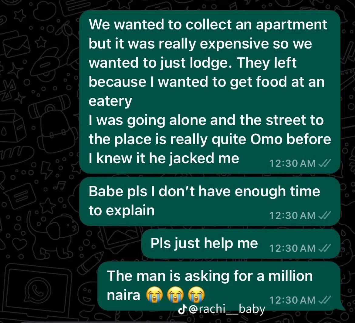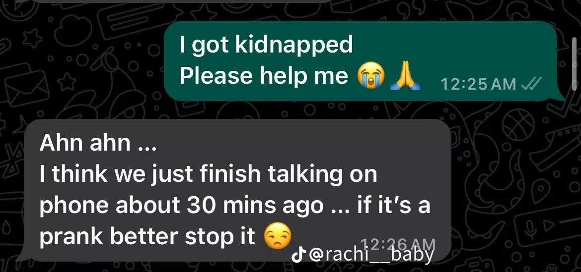 The post, captioned: “So I decided to prank my boyfriend for money and omoh,” showed the conversation between the Nigerian boyfriend and his girlfriend who lied to him about being kidnapped.