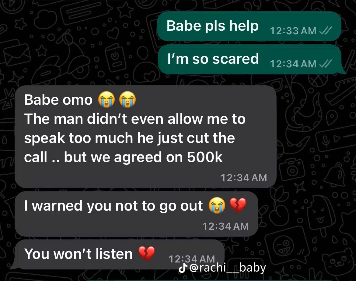 Initially, she told him the ransom was ₦1 million, but after a few minutes, the boyfriend explained that he thought she and the kidnapper had already agreed on ₦500,000.