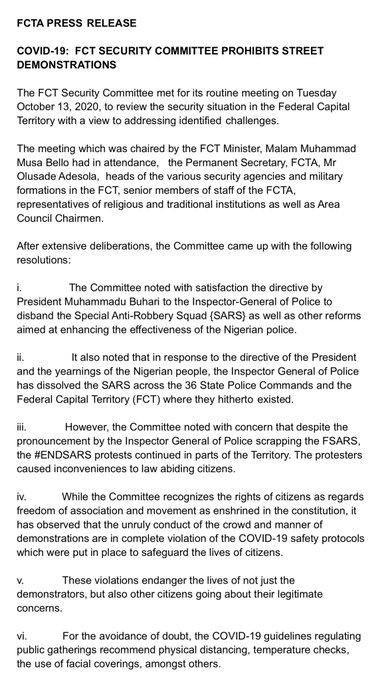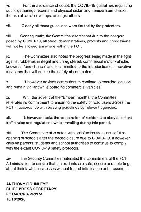 “Clearly, all these guidelines were flouted by the protesters. Consequently, the committee directs that due to the dangers posed by COVID-19, all street demonstrations, protests and processions will not be allowed anywhere within the FCT.”