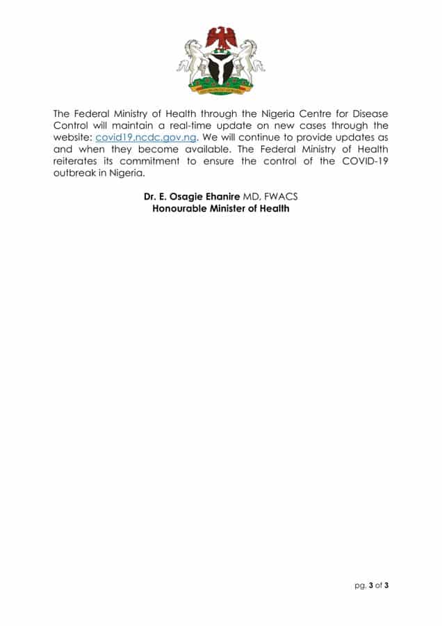All are Nigerians, 9 returning from Canada, France, Netherlands, Spain & UK, 1 close contact of a known case. In FCT, the cases are being treated at Uni. of Abuja Teaching Hosp., Gwagwalada. In Lagos, the cases are being treated at Infectious Disease Hosp., Lagos.”