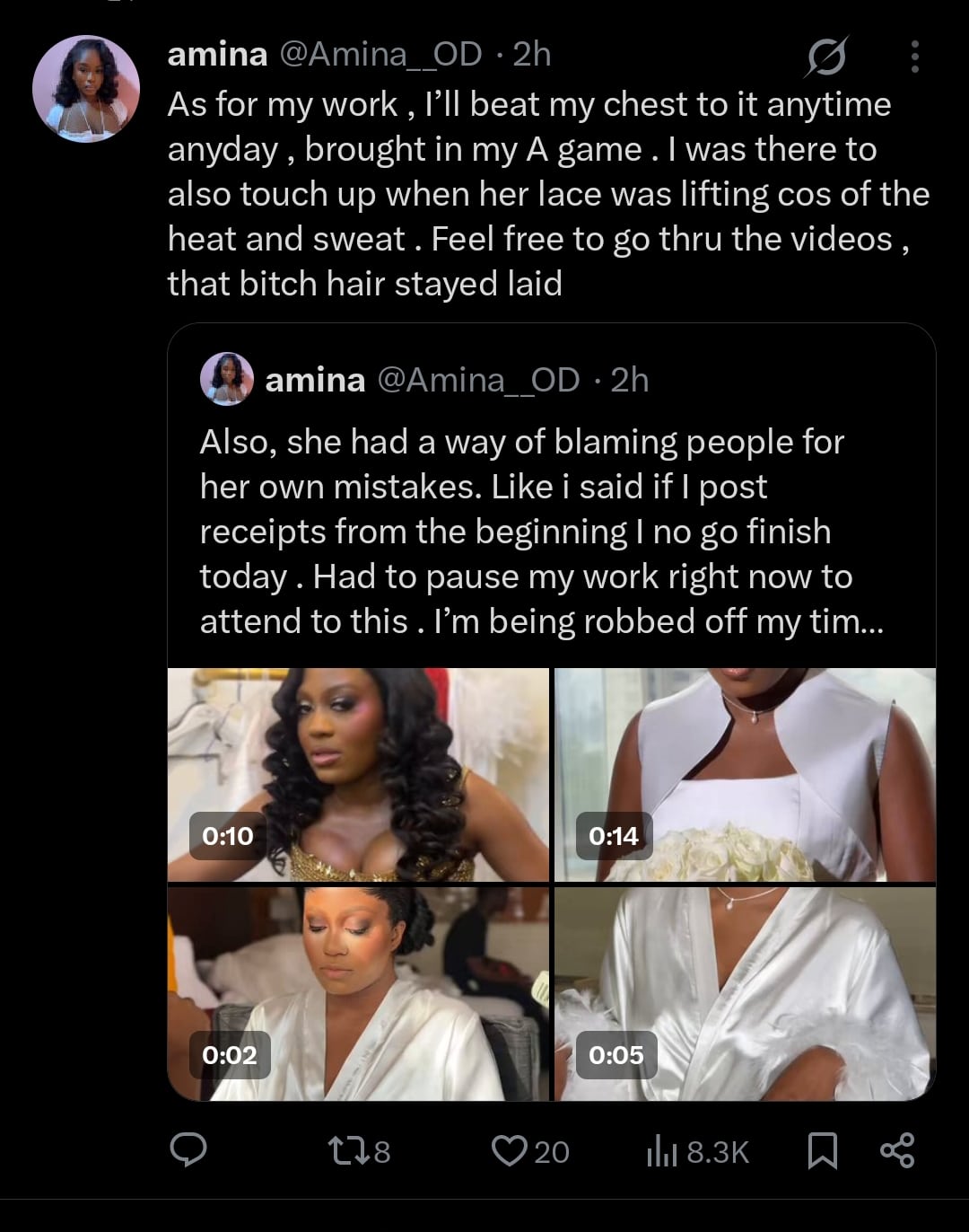 The stylist added that she delivered quality service despite challenges with the bride’s hair, which had noticeable flyaways. “My friend even asked why her hair had so many flyaways. I had to come up with something on the spot. This [bride] still found a way to blame me for her bridesmaids’ lateness.”