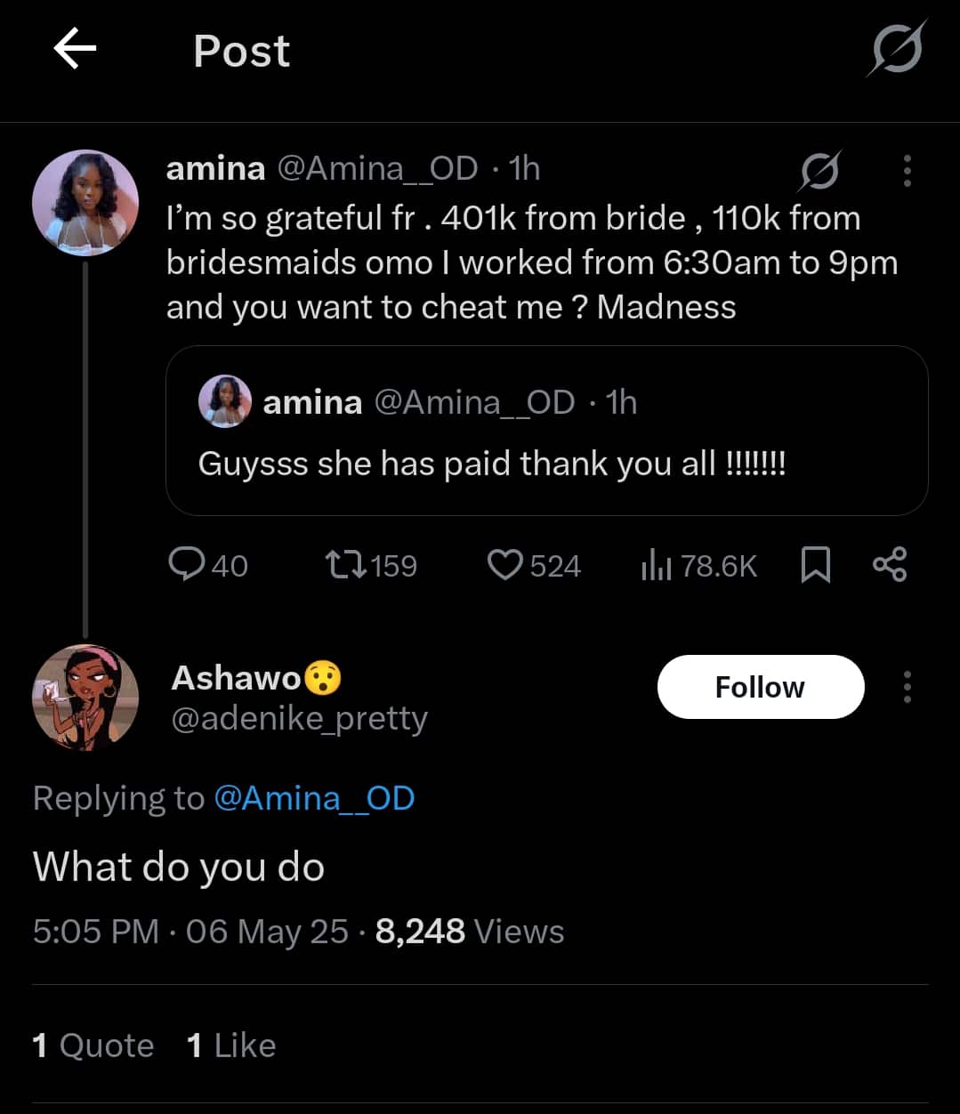 After dragging the bride and her team in several posts, she confirmed that the debt had been settled: “I’m so grateful fr. 401k from bride, 110k from bridesmaids. Omo, I worked from 6:30am to 9pm and you want to cheat me? Madness.”