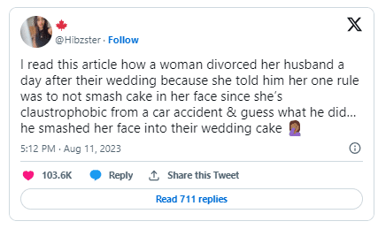 “I read this article how a woman divorced her husband a day after their wedding because she told him her one rule was to not smash cake in her face since she’s claustrophobic from a car accident & guess what he did…he smashed her face into their wedding cake.”