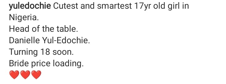 “Cutest and smartest 17yr old girl in Nigeria. Head of the table. Danielle Yul-Edochie. Turning 18 soon. Bride price loading.”