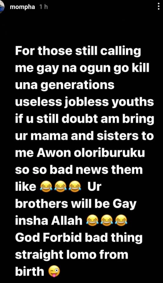“For those still calling me gay na ogun go kill una generations useless jobless youths if u still doubt am bring ur mama and sisters to me Awon oloriburuku so so bad news them like??? Ur brothers will be Gay insha Allah. God Forbid bad thing straight lomo from birth”