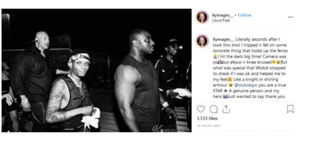 A British photographer Kym Images took to social media to applaud Nigeria singer, Wizkid for his kind gesture after she tripped and fell on concrete floor.