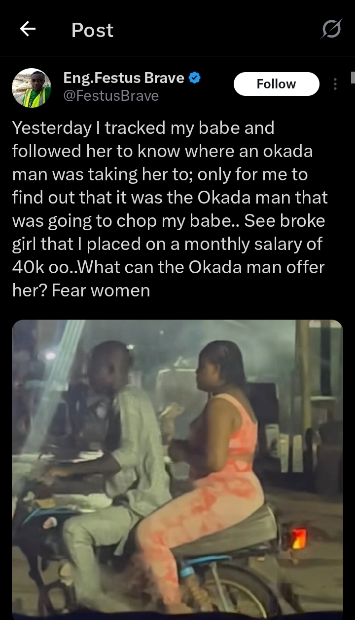 Yesterday I tracked my babe and followed her to know where an okada man was taking her to; only for me to find out that it was the Okada man that was going to chop my babe.. See broke girl that I placed on a monthly salary of 40k oo..What can the Okada man offer her? Fear women.