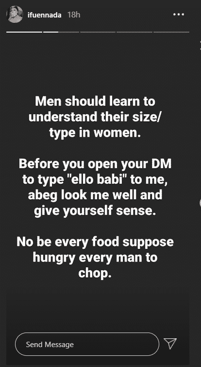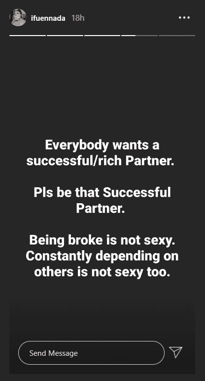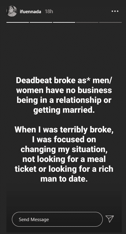 Former big brother Naija housemate, Iheme Faith Uloma, popularly known as Ifu Ennada, has slammed broke people who are trying to get into a relationship.