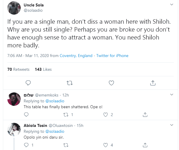 “If you are a single man, don’t diss a woman here with Shiloh. Why are you still single? Perhaps you are broke or you don’t have enough sense to attract a woman. You need Shiloh more badly.”