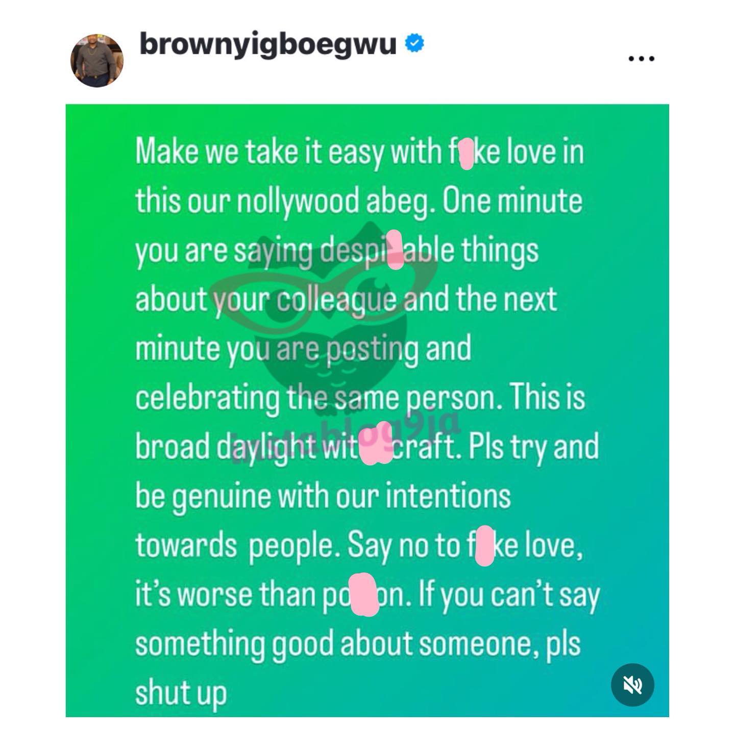 Veteran Nollywood actor, Browny Igboegwu, has taken to social media to express his disappointment with the level of hypocrisy among colleagues within the Nigerian movie industry.