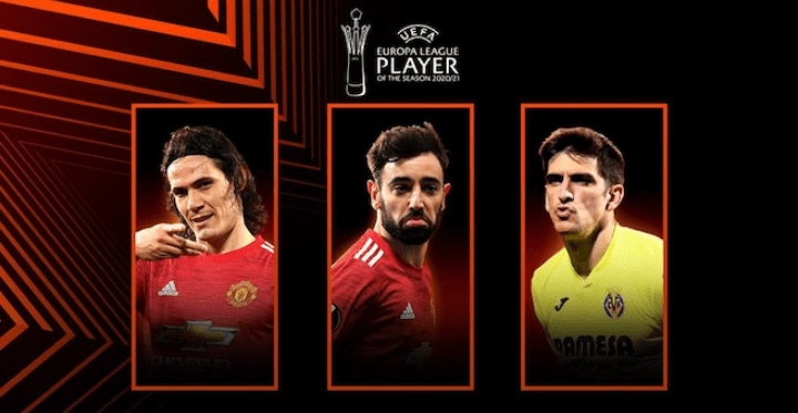 Manchester United influential midfielder, Bruno Fernandes appears for the second season running, while striker Edinson Cavani shone during a remarkable climax to the Europa league campaign for the English club, averaging a goal or assist every 41 minutes played.