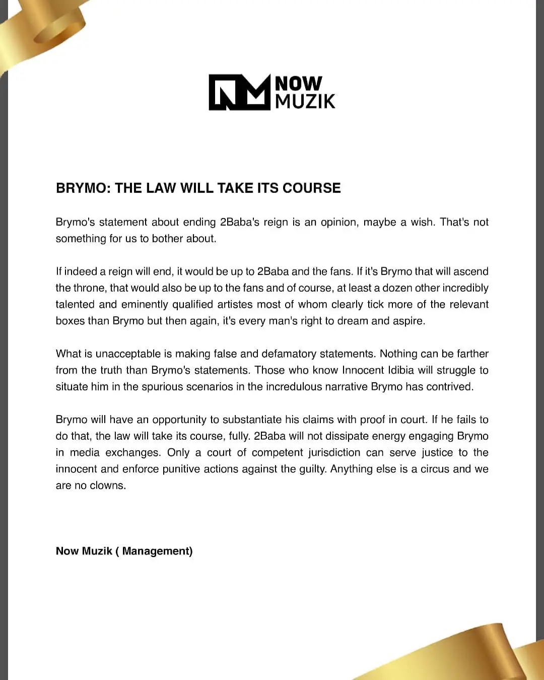 Brymo will have an opportunity to substantiate his claims with proof in court. If he fails to do that, the law will take its course, fully. 2Baba will not dissipate energy engaging Brymo in media exchanges. Only a court of competent jurisdiction can serve justice to the innocent and enforce punitive actions against the guilty. Anything else is a circus and we are no clowns.”