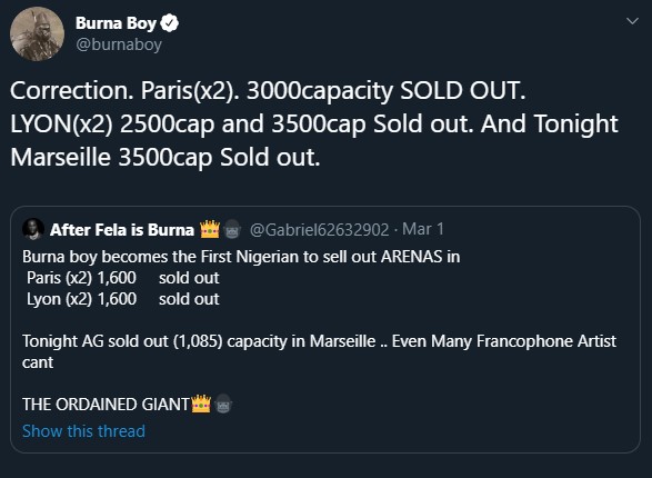 Then Burna replied: “Correction. Paris(x2). 3000capacity SOLD OUT. LYON(x2) 2500cap and 3500cap Sold out. And Tonight Marseille 3500cap Sold out.”