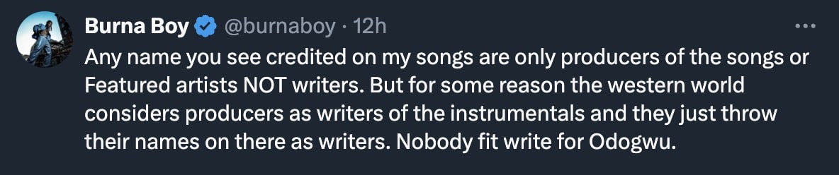 Reacting on his X handle, Burna Boy asserted that he does not use songwriters. The international star clarified that those credited as songwriters on his songs are the producers and the move is in accordance with Western music policies.