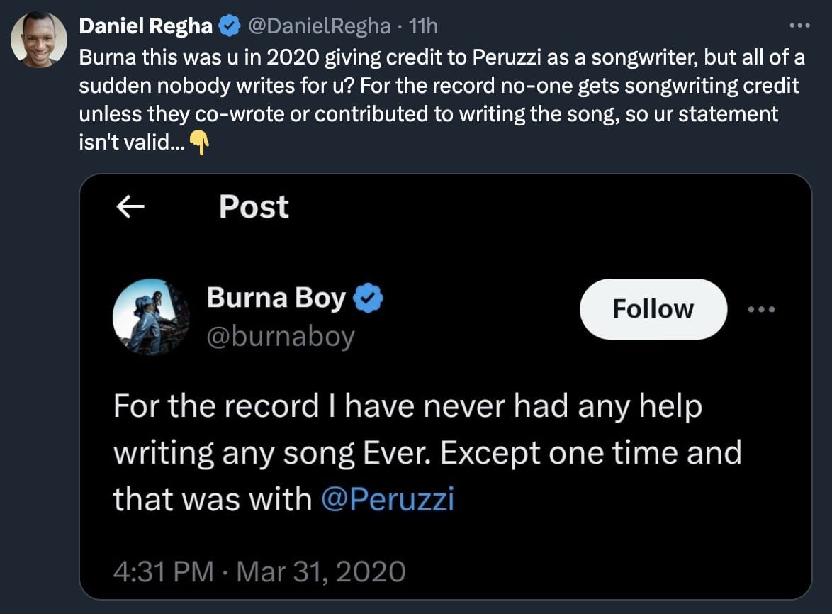 “Burna this was u in 2020 giving credit to Peruzzi as a songwriter, but all of a sudden nobody writes for u? For the record no-one gets songwriting credit unless they co-wrote or contributed to writing the song, so ur statement isn’t valid…👇,” he stated.