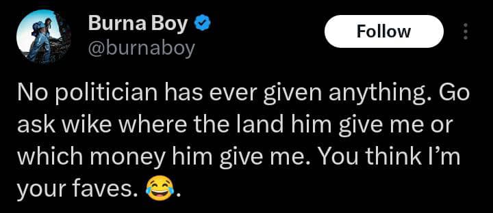 In another post, he vented about never getting anything from any politician. He said: “No politician has ever given anything. Go ask wike where the land him give me or which money him give me. You think I’m your faves. 😂.”
