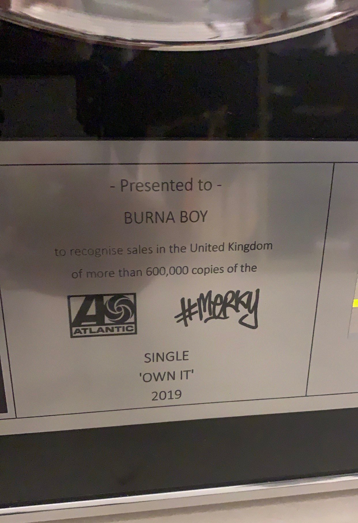Grammy Nominee, Burna boy shows off Platinum Plaque handed to him by Stormy for his feature in the track ‘Own It’.
