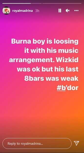 “Burna boy is losing it with his music arrangement. Wizkid was ok but his last 8bars was weak #b’dor
