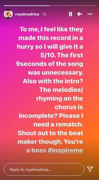 To me, I feel like they made this record in a hurry so I will give it a 5/10. The first 9seconds of the song was unnecessary. Also with the intro? The melodies/rhyming on the chorus is incomplete? Please I need a rematch. Shout out to the beat maker though.You’re a boss #inspireme”