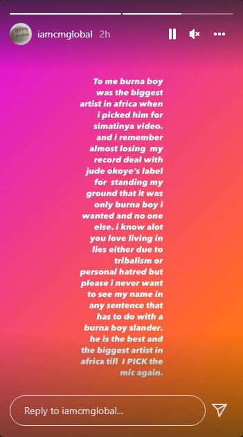 I know a lot you love living in lies either due to tribalism or personal hatred but please I never wanted to see my name in a sentence that has to do with a Burna Boy slander. He is the best and biggest artist in Africa till I pick the mic again”