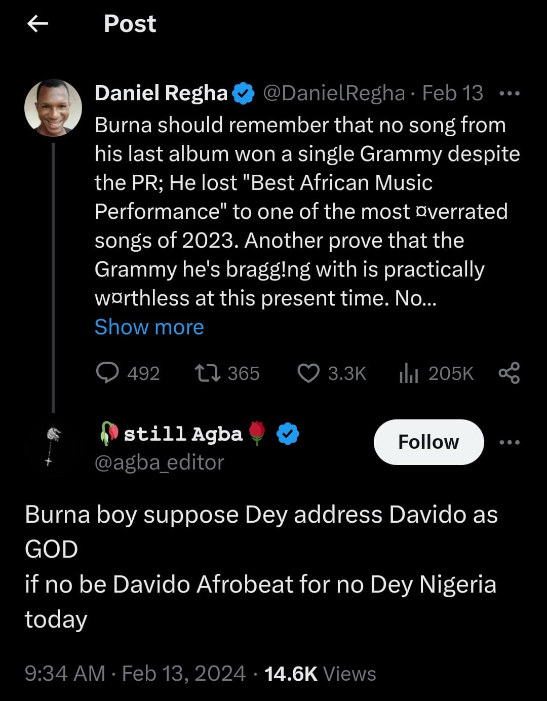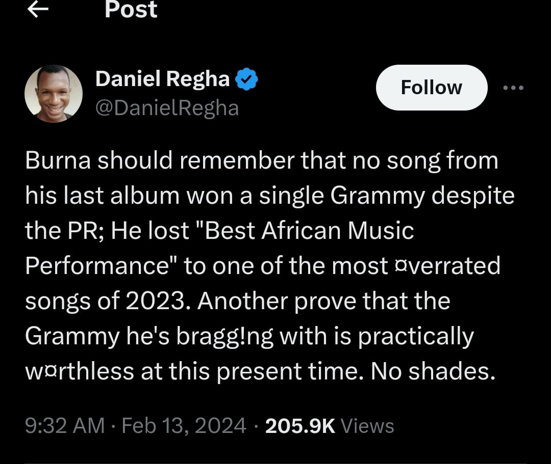 Daniel Regha wrote: “Burna should remember that no song from his last album won a single Grammy despite the PR; He lost “Best African Music Performance” to one of the most ¤verrated songs of 2023. Another prove that the Grammy he’s bragg!ng with is practically w¤rthless at this present time. No shades.”