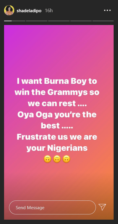 “I want Burna Boy to win the Grammys so we can rest… Oya Oga you’re the best…. Frustrate us we are your Nigerians” she wrote.