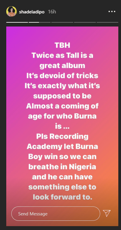 She continued; “Pls recording academy let Burna Boy win so we can breathe in nigeria and he can have something to look forward to.”