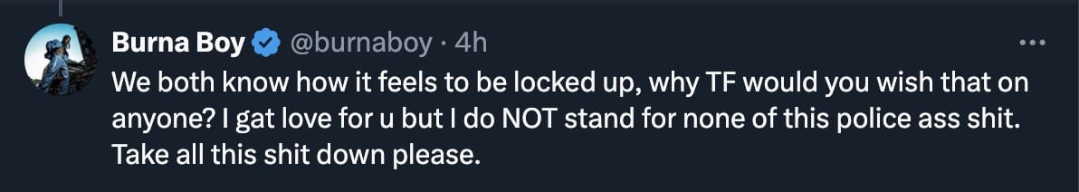 “Bro. WTF are you doing?? Take this down now !! Make me and u no get problem abeg . No be like this we dey handle differences. We both know how it feels to be locked up, why TF would you wish that on anyone? I gat love for u but I do NOT stand for none of this police ass shit. Take all this shit down please,” he wrote.