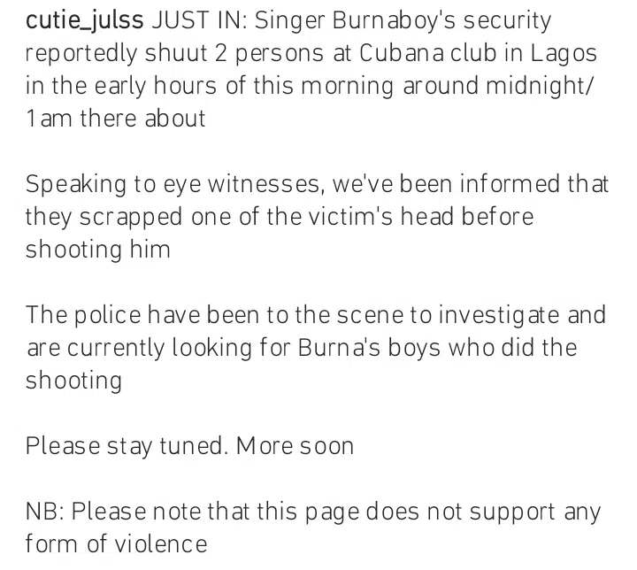 “Singer Burna Boy’s security reportedly shot 2 person’s at Cubana club in Lagos in the early hours of this morning around midnight/1am there about. Speaking to eye witnesses, we’ve been informed that they scrapped one of the victim’s head before shooting him. The police have been to the scene to investigate and are currently looking for Burna’s boys who did the shooting. Please stay tuned. More soon”.