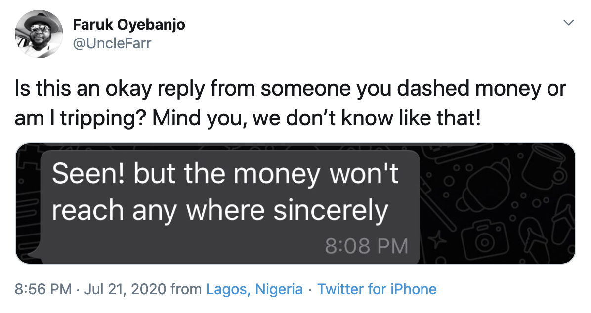 “Is this an okay reply from someone you dashed money or am I tripping? Mind you, we don’t know like that!”