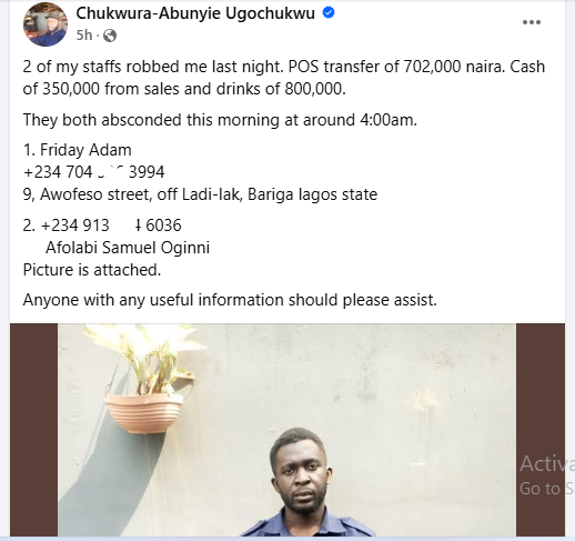 A Nigerian businessman, Chukwura-Abunyie Ugochukwu raises alarm as two of his staff, Afolabi Samuel Oginni and Friday Adam, reportedly rob him of N1.8M.