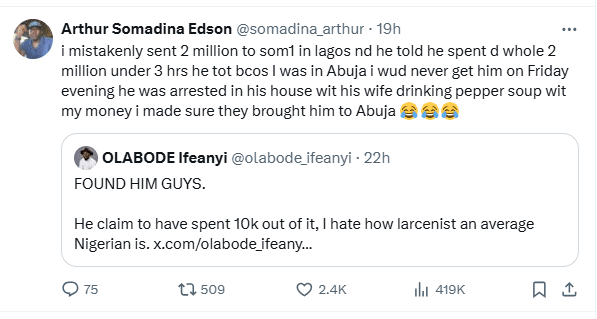 “i mistakenly sent 2 million to som1 in lagos nd he told he spent d whole 2 million under 3 hrs he tot bcos I was in Abuja i wud never get him on Friday evening he was arrested in his house wit his wife drinking pepper soup wit my money i made sure they brought him to Abuja 😂😂😂”