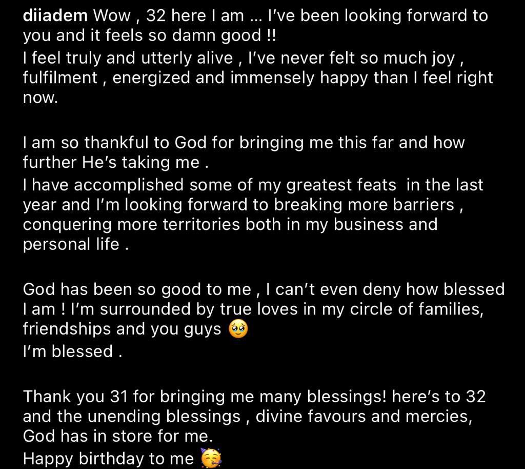 Popular Instagram businesswoman, Adeola Adeyemi, better known as Diiadem shares a beautiful birthday photo as she turns 32.