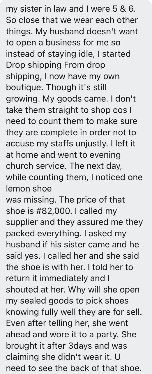 She also stated that this sister-in-law of hers rocked the shoe to a party and later brought it back in the pretence that she never wore it.