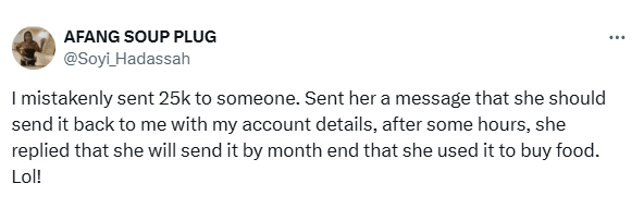 “I mistakenly sent 25k to someone. Sent her a message that she should send it back to me with my account details, after some hours, she replied that she will send it by month end that she used it to buy food. Lol!”