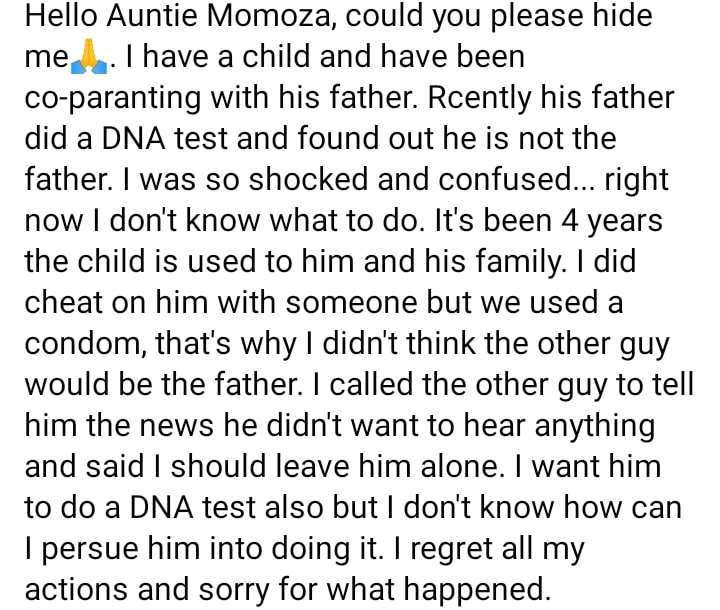 “Hello Auntie Momoza, could you please hide me🙏. I have a child and have been co-paranting with his father. Rcently his father did a DNA test and found out he is not the father. I was so shocked and confused… right now I don’t know what to do. It’s been 4 years the child is used to him and his family. I did cheat on him with someone but we used a condom, that’s why I didn’t think the other guy would be the father. I called the other guy to tell him the news he didn’t want to hear anything and said I should leave him alone. I want him to do a DNA test also but I don’t know how can I persue him into doing it. I regret all my actions and sorry for what happened.”