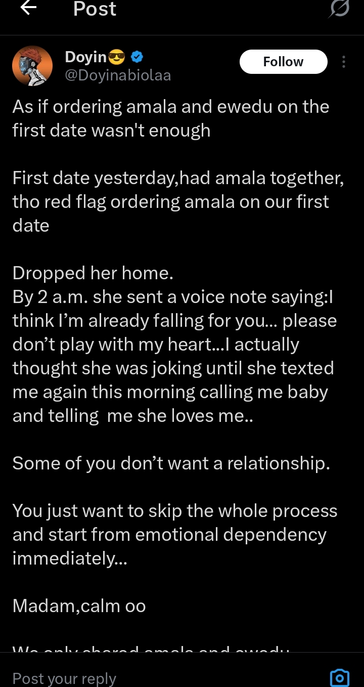 The The man, identified as @DoyinAbiolaa on X (formerly Twitter), shared details of his date with the lady who ordered Amala.