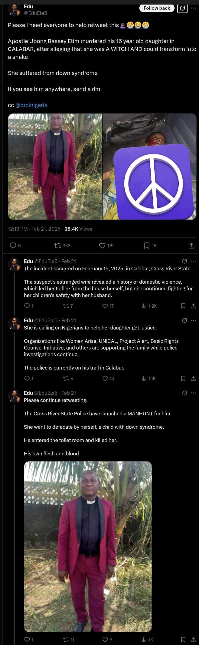 In her words, she wrote: “Apostle Ubong Bassey Etim murdered his 16-year-old daughter in Calabar after accusing her of being a witch who could transform into a snake. The young girl, who had Down syndrome, was brutally killed on February 15, 2025, in Calabar, Cross River State.”