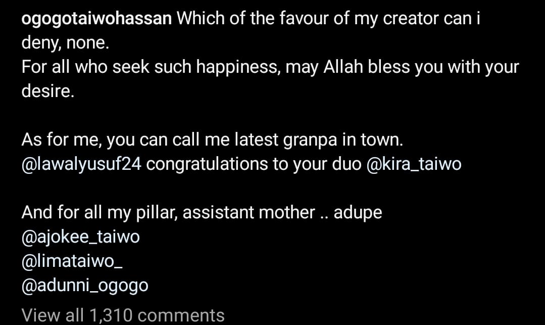 “As for me, you can call me the latest grandpa in town. @lawalyusuf24 congratulations to your duo @kira_taiwo.”