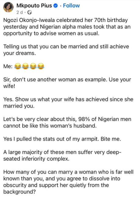 “Ngozi Okonjo-Iweala celebrated her 70th birthday yesterday and Nigerian alpha males took that as an opportunity to advise women as usual.