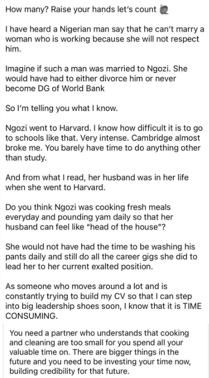 Cambridge scholar drags ABSU graduate who criticized her for saying 98% of Nigerian men can’t be like Okonjo’s husband