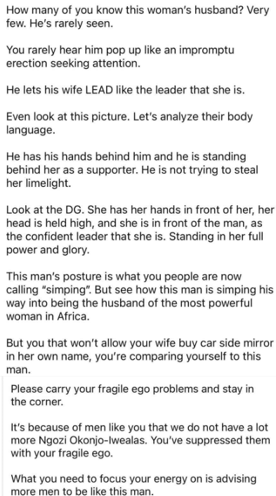 Imagine if such a man was married to Ngozi. She would have had to either divorce him or never become DG of World Bank