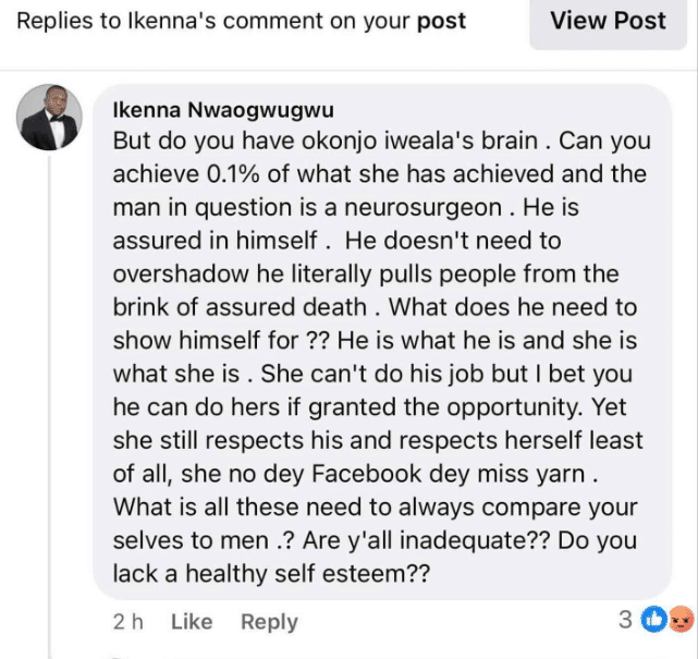 “But do you have okonjo iweala’s brain. Ikenna asked. Can you achieve 0.1% of what she has achieved and the man in question is a neurosurgeon.