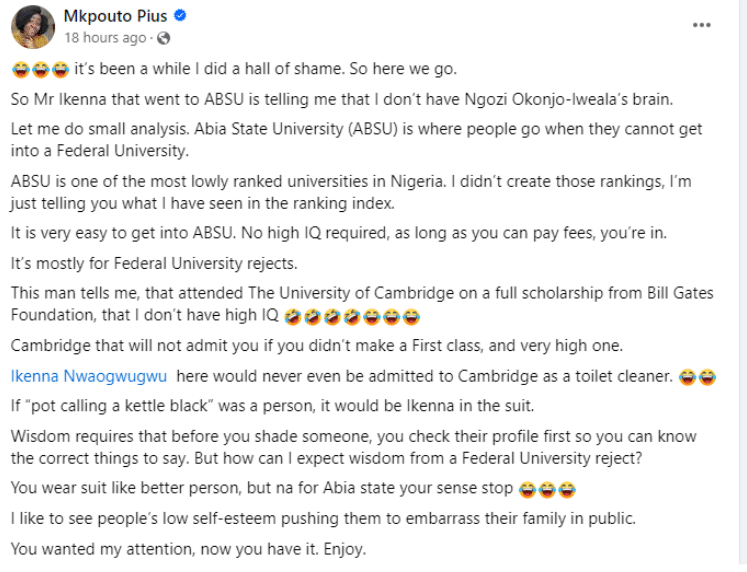 …“So Mr Ikenna that went to ABSU is telling me that I don’t have Ngozi Okonjo-Iweala’s brain. Let me do small analysis.
