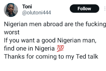 “Nigerian men abroad are the fucking worst. If you want a good Nigerian man, find one in Nigeria 💯