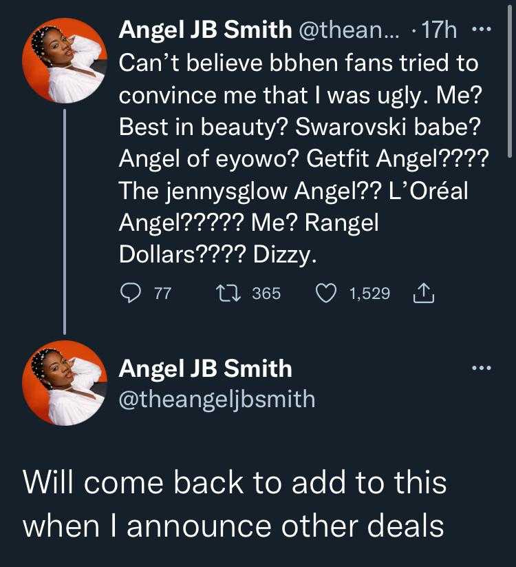 “Can’t believe bbhen fans tried to convince me that I was ugly. Me? Best in beauty? Swarovski babe? Angel of eyowo? Getfit Angel???? The jennysglow Angel?? L’Oréal Angel????? Me? Rangel Dollars???? Dizzy. Will come back to add to this when I announce other deals,” she wrote.