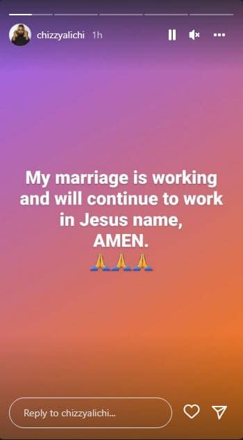 While social media users gave their two cents on the unfortunate occurrence, Chizzy Alichi took to her Instagram story to say a prayer for her marriage.