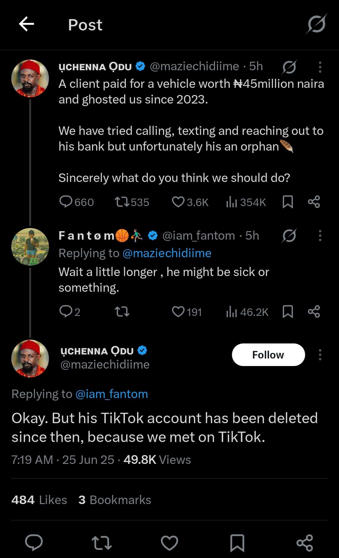 “A client paid for a vehicle worth ₦45 million naira and ghosted us since 2023,” he wrote. “We have tried calling, texting, and reaching out to his bank but unfortunately, he’s an orphan🪶.”